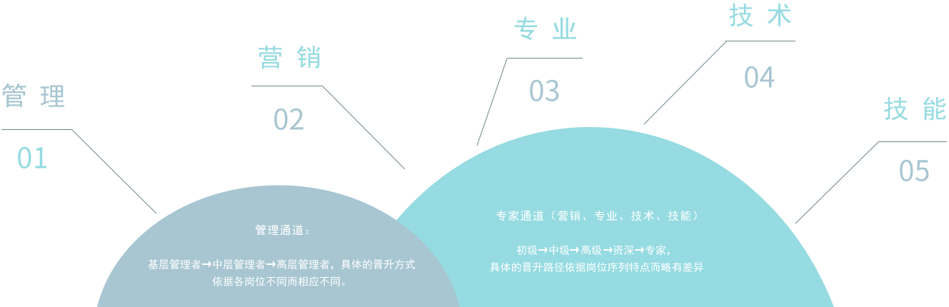職業發展路徑包括管理、營銷、專業、技術、技能五個通道路徑,可根據自身職業發展規劃選擇在相應路徑上不斷成長發展,也可在成長過程中,結合自身意愿,通過自身努力,跨路徑成長