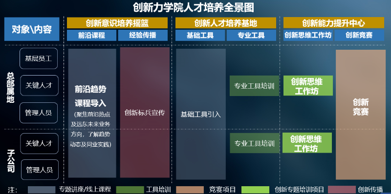 創(chuàng)新力學(xué)院主要負(fù)責(zé)激發(fā)員工創(chuàng)新精神,培育員工創(chuàng)新能力,聚合內(nèi)外部有創(chuàng)意的人才借力已有的資源將“創(chuàng)意”轉(zhuǎn)化為“創(chuàng)益”,通過提供共享設(shè)施、系統(tǒng)培訓(xùn)支持等,提升業(yè)務(wù)拓展、產(chǎn)品研發(fā)等創(chuàng)新能力和成果,提高市場競爭力。