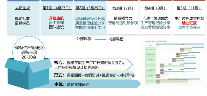 遠東于行業(yè)內率先引入精益生產(chǎn)”、智能制造”理念,遠東大學生產(chǎn)學院針對不同條線、不同崗位導入精益生產(chǎn)各個模塊的學習內容,舉辦有精益廠長特訓營、精益班組長特訓營、精益標桿游學項目,同時開辦了匠師項目-面向中高層管理人員、匠研項目-面向研發(fā)人員、匠英項目-面向基層管理人員、匠工項目-面向一線操作類人員。