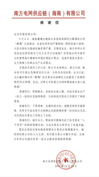 近日,南方電網供應鏈(海南)有限公司發來感謝信,對遠東電纜在關鍵時刻伸出援手表示衷心感謝,并期待在未來能夠與遠東電纜深化合作,共同為國民基礎供應服務提供更加堅強有力的物資保障。